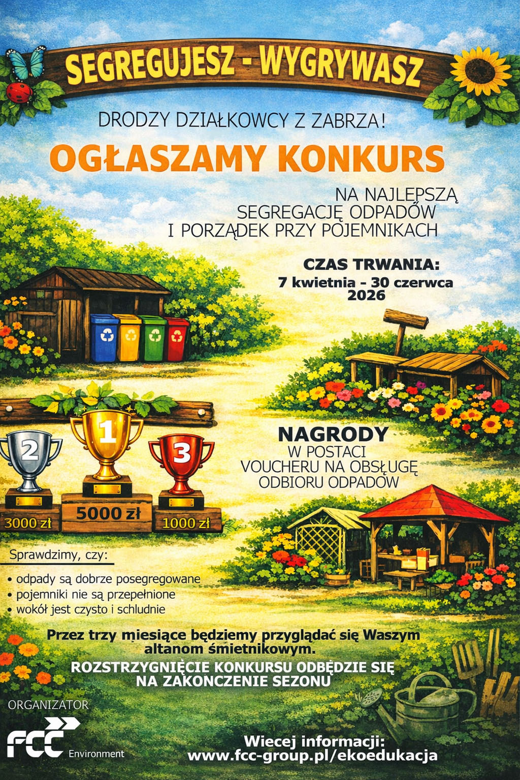 Od 7 kwietnia rusza konkurs na najlepszą segregację odpadów oraz utrzymanie porządku wokół altan śmietnikowych. Przez trzy miesiące firma FCC będzie obserwować, jak dbamy o czystość i prawidłowe sortowanie odpadów. To nie tylko okazja do zdobycia atrakcyjnych nagród, lecz także szansa, by wspólnie zadbać o estetykę i środowisko naszego ogrodu.